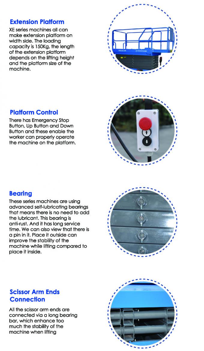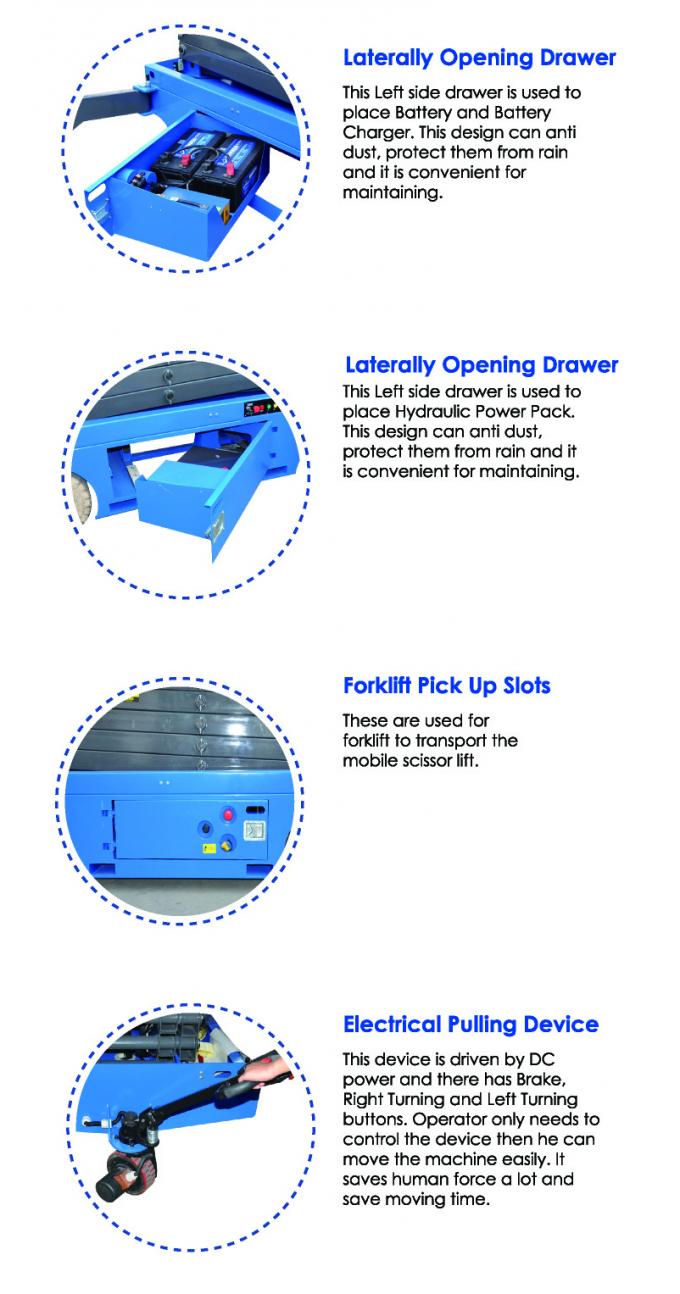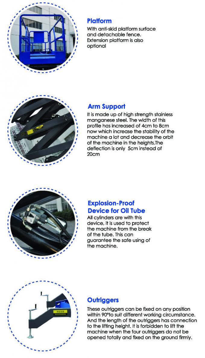 Lift ini sangat ideal untuk manuver dalam ruang yang ketat, baik untuk konstruksi indoor dan outdoor, pemeliharaan dan aplikasi instalasi. Ini menyediakan kapasitas yang sangat baik dan ruang kerja platform besar. Dibandingkan merek lain bermotor gunting hidrolik angkat, itu memiliki karakteristik yang lebih stabilitas, aman, ringkas dan cerdas.